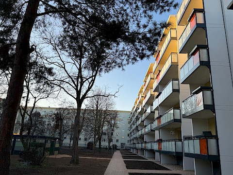 Die Baumaßnahmen sind weitestgehend abgeschlossen. Die Außenanlagen wurden inzwischen wieder hergerichtet. Die noch ausstehende Bepflanzung der Grünflächen ist für das Frühjahr vorgesehen. Darüber hinaus wurde das Fahrradhaus bereits zur unentgeltlichen Nutzung freigegeben. Lediglich kleinere Restarbeiten im Treppenhaus werden noch durchgeführt und planmäßig im Januar 2026 abgeschlossen.