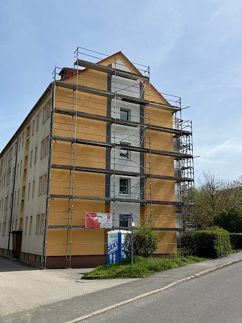 Auch unser zweites Bauprojekt im Jahr 2026 nimmt sichtbar Fahrt auf. Das Objekt ist inzwischen vollständig eingerüstet, und die Malerarbeiten an der Fassade haben planmäßig begonnen. Erste Farbakzente lassen bereits erkennen, wie sich das Erscheinungsbild des Gebäudes in den kommenden Wochen verändern wird.