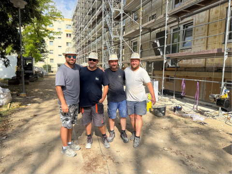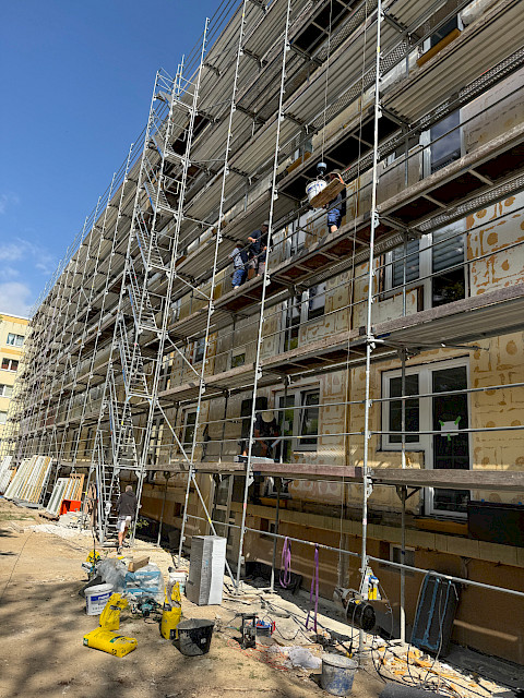 Trotz teils hoher Temperaturen gehen die Arbeiten an der Fassade zügig voran: Die Halterungen für die neuen Balkone sind bereits montiert und das Wärmedämmverbundsystem wird aktuell erneuert.