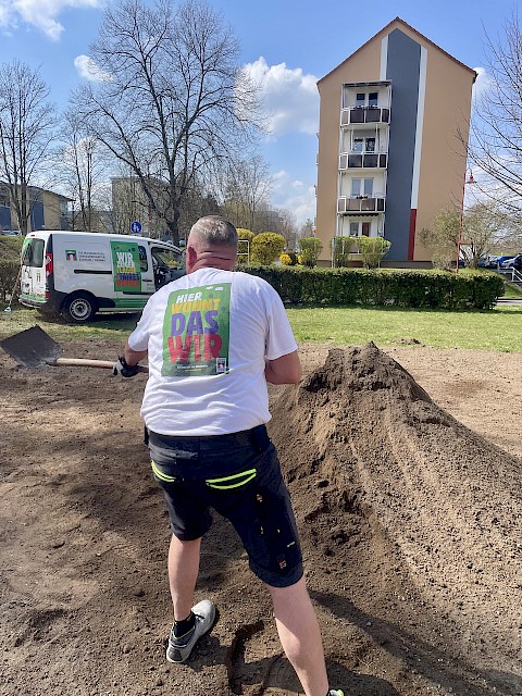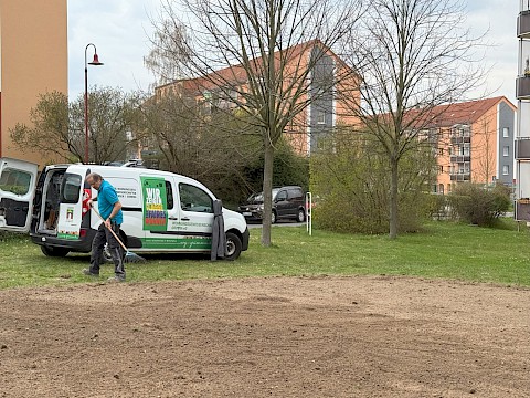 Mit viel Tatkraft und der spontanen Unterstützung eines engagierten Mieters haben unsere Mitarbeiter die Fläche vorbereitet und neu angesät.